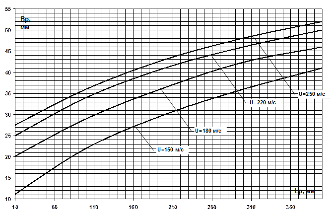 Рис. 1д. Осьвий габарит активного ступеня ПТ в залежності від віяльности, привндений до середнього діаметру 1м (по Е.А. Іпатову)
