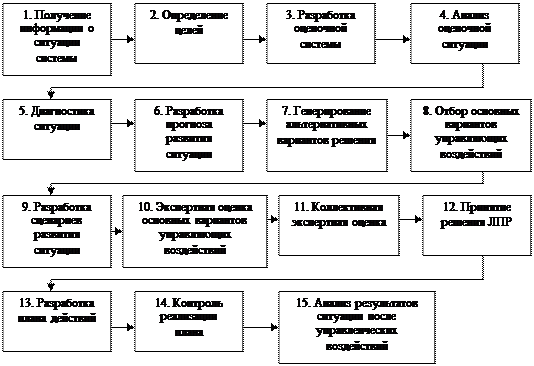 В целом процесс разработки и выбор управленческого решения реализуется, как правило, путем итеративного приближения к требуемым результатам и содержит ряд этапов. Выявление и анализ проблемной ситуации. Анализируется исходная информация о состоянии объекта исследования и внешней среды, определяется место и роль анализируемых объектов исследования среди смежных объектов более высокого порядка, выявляют проблемы, их структурируют и ранжируют. На этом этапе определяются стратегические направления решения выявленных проблем для последующего формирования целей. Стратегические варианты решения выявленных проблем излагаются в сценарии. Под сценарием понимается вербально-аналитическое описание существующего и прогнозируемого состояния объекта исследования, принципиальных подходов к решению проблем. Сценарий содержит предварительный расчет ресурсов, необходимых для решения проблем в рамках различных стратегических направлений их реализации. Конечным результатом работ здесь является выявление базовых проблем, за решение которых надо браться в первую очередь, ранжирование этих проблем и выбор стратегического направления их решения с предварительной ресурсной оценкой. Формирование целей. Определяются цели решения базовых, кардинальных проблем. На практике используется достаточно широкий диапазон способов задания целей: от их простого перечня до построения графа (дерева) целей с характеристиками их приоритетов. Цели должны иметь конкретные формулировки и количественные характеристики, по которым можно будет судить о степени их достижения. Это и является конечным результатом работ на втором этапе. Выявление полного перечня альтернатив. На этом этапе определяется совокупность альтернатив вариантов (способов, средств) достижения поставленных целей. В реальных условиях обычно рассматриваются два-три варианта решения, не более: меньше трудоемкость анализа, меньше шансов совершить грубую ошибку. Однако и нет шансов принять наилучшее решение. Среди них вообще может не быть наилучшего. При большом наборе вариантов решений появляется шанс того, что в их числе есть наилучший. Выбор допустимых альтернатив. Альтернативы, выявленные на предыдущем этапе, пропускаются через «фильтр» различных ограничений (ресурсных, юридических, социальных, морально-этических и т.п.). Конечным результатом работ на данном этапе является множество альтернатив удовлетворяющих ограничениям. Предварительный выбор лучшей альтернативы. Производится детальный анализ допустимых альтернатив с точки зрения достижения поставленных целей, затрат ресурсов, соответствия конкретным условиям реализации альтернатив. При решении достаточно сложных задач на основе одних количественных расчетов зачастую сложно выработать однозначные рекомендации о предпочтении одной альтернативы всем другим. Возможно выделение группы предпочтительных (эффективных) альтернатив, полученных, скажем, на основе оптимизации по Парето. Конечным результатом работы на данном этапе является вынесение суждения о предпочтительности альтернатив. Эти данные системными аналитиками предоставляются лицу, принимающему решение по изучаемой проблеме. Оценка альтернатив со стороны ЛПР. На основе данных, полученных на предыдущем этапе, а также с помощью любой другой инфор
