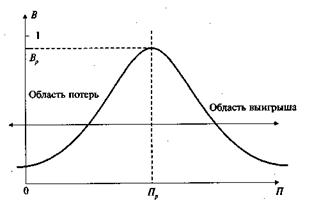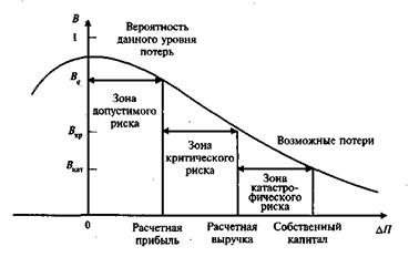 Область, в которой потери не ожидаются, т.е. экономический результат хозяйственной деятельности положительный, называется безрисковой зоной. Зона допустимого риска — область, в пределах которой величина вероятных потерь не превышает ожидаемой прибыли и, следовательно, коммерческая деятельность имеет экономическую целесообразность. Граница зоны допустимого риска соответствует уровню потерь, равному расчетной прибыли. Зона критического риска — это область возможных потерь, превышающих величину ожидаемой прибыли вплоть до величины полной расчетной выручки (суммы затрат и прибыли). Другими словами, здесь предприниматель рискует не только не получить никакого дохода, но и может понести прямые убытки в размере всех произведенных затрат. И, наконец, зона катастрофического риска — область вероятных потерь, которые превосходят критический уровень и могут достигать величины, равной собственному капиталу организации. Катастрофический риск способен привести организацию или предпринимателя к краху и банкротству. (Кроме того, к категории катастрофического риска независимо от величины имущественного ущерба следует отнести риск, связанный с угрозой жизни или здоровью людей и возникновением экологических катастроф.) Наглядное представление об уровне риска дает графическое изображение зависимости вероятности потерь от их величины — кривая риска. Построение такой кривой базируется на гипотезе, что прибыль, как случайная величина, подчинена нормальному закону распределения (рисунок 2) и предполагает следующие допущения: · наиболее вероятно получение прибыли, равной расчетной величине — /7Р. Вероятность (Вр) получения такой прибыли максимальна и значение П можно считать математическим ожиданием прибыли. Вероятность получения прибыли, большей или меньшей по сравнению с расчетной, монотонно убывает по мере роста отклонений; · потерями считается уменьшение прибыли (∆ /7) в сравнении с расчетной величиной. Если реальная прибыль равна П, ∆/7то = П Р — П.