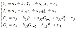 где Y - национальный доход; С - расходы на личное потребление; I - чистые инвестиции; Q - валовая прибыль экономики; Р - индекс стоимости жизни; R - объем продукции промышленности; t - текущий период; t-1 - предыдущий период. Вариант 2. Конъюнктурная модель: