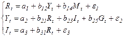 В этой матрице 1-й столбец соответствует коэффициентам при переменной Матрица, которая строится для проверки достаточного условия идентификации, имеет только одну строку (первая строка, соответствующая первому уравнению, отбрасывается); кроме того, из общей матрицы отбрасывается столбцы, соответствующие переменным, присутствующим в первом уравнении, т.е. первый, второй и третий столбцы. Таким образом, получаем матрицу, состоящую только из одного элемента: Определитель этой матрицы, очевидно, не равен нулю, поскольку Достаточное условие идентификации выполнено для первого уравнения. 2-ое уравнение. В этом уравнении также две эндогенные переменные ( Для проверки достаточного условия идентификации, как и в предыдущем случае, составляем матрицу аналогично предыдущему случаю, только здесь отбрасываем из матрицы А вторую строку и первый, второй, четвертый столбцы. Остается матрица из единственного элемента: Ее определитель не равен нулю, поскольку Таким образом, достаточное условие идентификации выполнено и для второго уравнения Поскольку оба уравнения в системе являются идентифицируемыми, то и вся модель также является идентифицируемой. Методом оценки параметров модели в случае, если она идентифицируема, является косвенный метод наименьших квадратов. Для того, чтобы оценить параметры СФМ, необходимо записать приведенную форму модели. В данном случае она имеет вид: