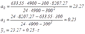 Для проверки качества регрессии оценим коэффициент детерминации и критерий Дарбина-Уотсона. Выполним прогнозную оценку на 2 месяца вперед. Результаты изобразим графически. Решение задачи можно выполнить вручную (см. таблицу), либо с использованием ППП MS Excel.