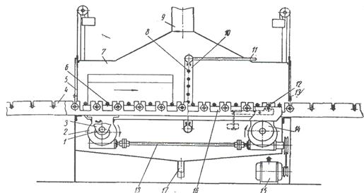 а ) жалпы көрінісі; б) камераның кесіндісі;в)бактың сұлбасы; г) лентаның жетегі 5.1-сурет. Үш камералы жуу машинасы Жөндеу зауыттарында әмбебап жуу машиналарынан басқа арнайы бөлшектерді жууға арналған жуу машиналары да қолданылады. Мұндай машиналарды ағымды бөлшектеу кеңістіктерінде орналастырады. Сондықтан бөлшектердің цех ішінде тасымалдау ара қашықтығы айтарлықтай қысқарады, сонымен қатар цех ішінде тазалық сақталып отырады. Егер бөлшектерді бөлшектеу орнынан жуу машинасына дейін тасымалдағанда, бөлшектерден май ағып өндіріс орнын ластайды. Коллектор мен құбырдан ажыратылмаған цилиндр блогін жуу үшін арналған машина. Бұл машина дизельді бөлшектеу орны мен блокты жинау орны арасында орналасқан. Жуу машинасының құрылысы: камера, рольганг, червякті редуктор, балка, шашыратқыш коллектор. Червякті редуктор рольганг рамасының төменгі жазықтығына бекітілген. Редуктор бөлшектері ортақ білікпен орнатылған және де электроқозғалтқыш арқылы қозғалысқа келеді. Екі дөңгелек те сағат тілі бойымен айналады. Сол жақта орналасқан редуктор білігінің екі соңындағы дөңгелектерге кривошиптер бекітілген. Балканың оң жағындағы ұшы оң жақта орналасқан редуктор білігінің дөңгелегіндегі кривошипке орнатылған екі роликке тіреледі. Оң және сол жақтағы кривошиптердің синхронды айналуына байланысты балка перекладинасы кривошип сызған шеңберге тең шеңбер сызып отырады. Кривошиптің 180˚-қа айналу кезінде балканың жоғарғы жазықтығы рольганг жазықтығынан жоғары болады, тағы 180˚-қа айналғанда балка жазықтығы рольганг жазықтығынан төмен орналасады. Осының көмегімен жуылатын блок балка көмегімен рольганг үстіне көтеріледі, бірнеше уақыт аралығына оң жаққа көтеріледіде, рольганг үстіне түсіріледі. Балка келесі айналым жасап, рольгангтан төмен орналасады, блокқа түйіседі де келесі операцияны орындау үшін блокты көтереді. Осы арқылы блок біртіндеп сол жақтан оң жаққа қарай ауысады. Ыстық су сорғылық станциядан құбыр арқылы 4-5 атмосфералық қысыммен машинаға беріледі. Содан кейін құбыр арқылы сорғылық станцияның төменгі багына ағады. Құбыр желдету қызметін де атқарады. Блокты рольгангтың сол шығыңқы жағына орналастырады. Бірқалыпты кіру жапқышын көтеріп, рольганг бойымен машинаға бағыттайды. Электроқозғалтқыш өшірілген кезінде балканың арнайы блокировкасының көмегімен, балка төменгі қалпына келеді де, блокты бағыттауға кедергі жасамайды. Осыдан кейін жапқышты түсіріп, балканың электроқозғалтқыш жетегі мен сорғыны іске қосады. Коллектордан өткен блок электрлік блокировка механизмімен байланысқан роликке әсер етеді. Сонымен қатар жетектің электроқозғалтқышы автоматты түрде өшіріледі, осыдан кейін балка төменгі жағына келіп тоқиайды. Осы уақытта сорғылық станциядағы сорғы да өз жұмысын тоқтатады. Осыдан кейін шығу жаппқышын көтереді де, блокты рольгангтің оң жағында орналасқан шығыңқы бөлігіне шығарып жібереді. 5.4 Блок тазалайтын машинаның артықшылықтары Бөлшек машинаға кіргенде де, шыққанда да жұмысты ауырлатпайды. Тазаланатын бөлшек машина камерасына кірген кезде тасымалдағыш қозғалысының жылдамдығымен бірдей кіріп-шығады. Осыған байланысты машина жабық есіктермен жұмыс істейді, ал жай машиналардың камералары ашық болады. Резинадан немесе брезенттен жасалған жапқыштар герметизацияны қамтамасыз ете алмайды. Сонд