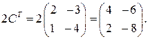 Умножение матрицы А на матрицу В определено, когда число столбцов первой матрицы равно числу строк второй. Тогда произведением матрицы Аm × k на матрицу Вk × n называется матрица Сm × n , каждый элемент которой сij равен сумме произведений элементов i -й строки матрицы А на соответствующие элементы j -го столбца матрицы В: