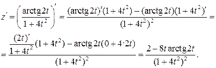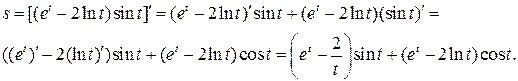 б) Используя правила дифференцирования произведения функций II, разности I, формулы (5), (7), (8) и учитывая, что независимая переменная есть t, т. е. t =1, получим: