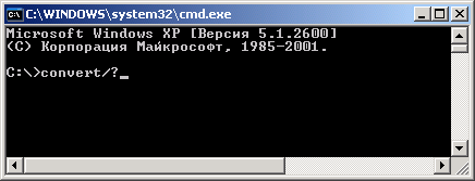 Если на компьютере установлена файловая система FAT, то для установки файловой системы NTFS следует воспользоваться программой-конвертером файловых систем convert.exe, входящей в стандартный комплект поставки Windows XP. Запуск этой программы производится в текстовом командном окне, например, программы cmd.exe. Программу можно запустить, указав ключ "/help" в качестве аргумента (рис. 1.3).