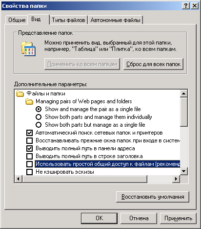 Рисунок 1.6. Окно настройки отображения файлов и папок В открывшемся окне рекомендуется найти строку Использовать простой общий доступ и убедитесь, что флажок убран (рис.1.7.). Примечание: для того, чтобы все программы, файлы и ссылки активировались с одного щелчка мышью, то необходимо поставить опцию Щелчки мышью в положение Открывать одним щелчком, выделять указателем (рис.1.6.).
