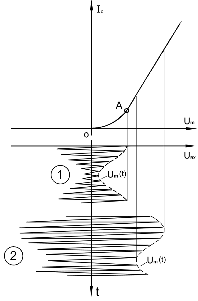 Рисунок 6.3 Характеристика детектирования. Работа АМ детектора в режиме малых (1) и больших (2) сигналов.
