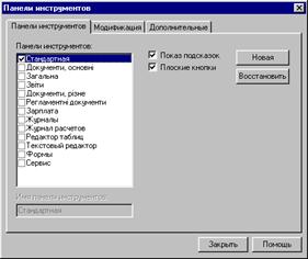 Панелі інструментів. Під рядком меню розміщуються панелі інструментів (Рис.3). Панелі інструментів — це рядок кнопок, при натисканні яких виконується певна дія. Для натискання кнопки слід клацнути мишою по кнопці. При фіксації курсору миші на кнопці під нею з’являється її назва, а в рядку стану — коротка довідка про призначення кнопки. Ряд кнопок дублюють відповідні команди меню. Однак користуватись кнопками панелі значно швидше і зручніше. „1С-Підприємство 7.7” забезпечує користувача декількома панелями інструментів. Для вибору потрібної панелі слід скористатись командою Сервис/Панели инструментов... (Рис.3). При цьому на екрані з’явиться вікно діалогу, у списку якого можна вибрати необхідні панелі. Рис. 3 Вибір панелі інструментів. Основними з них є наступні: