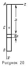 1.Тонкий однородный стержень длины l и массы М. Вычислим его момент инерции относительно оси Аz, перпендикулярной к стержню и проходящей через его конец А (рис. 20). Направим вдоль АВ координатную ось Ах. Тогда для любого элементарного отрезка длины dx величина h=x, а масса dm = = p1dx, где p1=M/l - масса единицы длины стержня. В результате