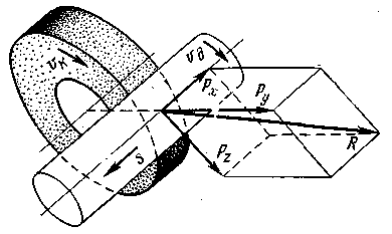 где с — величина упругого отжатия, направленная в сторону уменьшения глубины резания; t — номинальная глубина резания (поперечная подача); х - часть выступа (+) или впадины (-), оставшаяся неснятой при предыдущем проходе зерна. Величина с в период врезания увеличивается; при установившемся резании она примерно постоянна, а в период выхаживания постепенно уменьшается. Процесс шлифования обычно состоит из трех периодов: врезания, установившейся обработки и выхаживания — обработки при отсутствии поперечной подачи. Резание при выхаживании происходит в результате упругого натяга в системе круг — деталь. При врезании происходит постепенное увеличение сил резания, связанное с увеличением глубины резания. Интенсивность роста сил резания зависит в основном от режима шлифования и жесткости системы. При установившемся съеме, металла величина сил резания стабилизиру- ется. При выхаживании силы резания постепенно уменьшаются. Большое влияние на силы резания оказывают рельеф рабочей поверхности круга, микрогеометрия абразивных зерен и ширина круга В: при затуплении зерен, засаливании круга и при увеличении В силы резания возрастают. Основная часть энергии, затрачиваемой на шлифование, расходуется на преодоление трения, возникающего между обрабатываемой деталью и абразив- ными зернами, а также связкой. Работа, идущая на пластическую деформацию срезаемого слоя, составляет лишь 18-25% работы шлифования. Очень большая деформация срезаемого слоя при шлифовании обусловлена малыми толщинами среза и большими отрицательными передними углами (γср = - 45°). Поэтому при шлифовании для съема единицы объема металла за- трачивается в 10-20 раз больше энергии, чем при точении и фрезеровании. Равнодействующая R всех нормальных и касательных сил, действующих на рабочей поверхности круга, так же как и при точении, является суммой трех сил Рz, Ру и Рх (рис. 62).