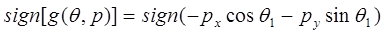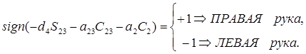 (9-1) где Возможны следующие варианты: 1) Если 2) Если 3) Если Поскольку знаменатель выражения (9-1) всегда положителен, определение ЛЕВОЙ/ПРАВОЙ конфигурации сводится к определению знака числителя РУКА= где функция sign определена равенством (8-14). Подстановкой первой и второй компонент вектора р из равенства (7-7) в равенство (9-2) получаем: РУКА= Следовательно, из уравнения (9-3) значение индикатора РУКА для ПРАВОЙ/ЛЕВОЙ конфигурации манипулятора устанавливается выражением: РУКА= При выводе уравнения конфигурации для индикатора ЛОКОТЬ используем определение ВЕРХНЕЙ/НИЖНЕЙ руки. Взяв