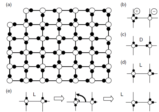 Рис. 5. Бьерум дефекты. (a) Двумерная с неупорядоченными протонами решётка льда (Бьерум дефекты показаны между молекулами 4–5, в ряду 5). Открытые кружки: атомы кислорода; заштрихованные кружки: атомы водорода. (b) Ионные ( (c) Бьерум дефекты нарушают правило 2 (имеется только один атом водорода вдоль каждого (d) Бьерум L-дефекты (или L-нарушения), где отсутствуют атомы водорода на (e) Перемещение (большая искривлённая стрелка) Бьерум L-дефекта индуцирует реориентацию (в трёх измерениях) одной тетраэдрической молекулы воды (маленькая стрелка). Состав и структура гидратов. Все наиболее распространённые и известные гидраты природных газов принадлежат к трём кристаллическим структурам: кубической структуре В связи с тем, что все три структуры в качестве молекулярной основы содержат порядка 85% воды, многие механические свойства гидратов подобны соответствующим свойствам льда структуры Пятиугольные и шестиугольные грани являются основными в гидратной полости.