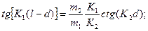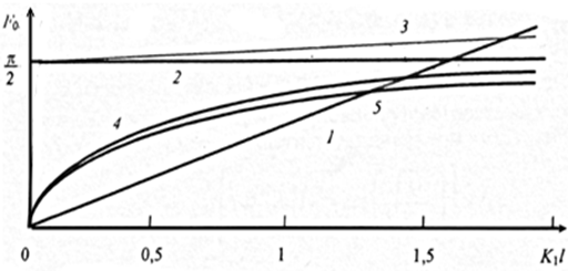 На рис. 1.10 представлено решение уравнения (1.8.6) графическим методом. Разрешенные значения K1 при известной ширине КЯ (2l) определяются точками пересечения прямой 1 (соответствующей правой части уравнения (1.8.6)) с зависимостями Анализ (1.8.6), (1.8.7) и приведенных зависимостей показывает, что для основного четного состояния: 1 - уменьшение эффективной массы m2 сдвигает разрешенный уровень энергии в область больших энергий; 2 - увеличение ширины d и глубины U провала понижает разрешенный уровень энергии; 3 - результирующее смещение уровня энергии определяется суперпозицией данных эффектов, при этом влияние эффективной массы обычно слабее. Так, при m2→0 аргумент arctg в (1.8.7) стремится к