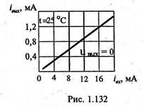 Напомним, что излучающий диод (слева) должен быть включен в прямом направлений, а фотодиод — в прямом (режим фотогенератора) или в обратном направлении (режим фотопреобразователя). Воспользуемся общепринятым выбором условно-положительных направлений Для тококи напряжений диодов оптопары (рис. 1.131,6). Изобразим зависимость тока iвых от тока iвх при uвых=0 для оптопары АОД107А (рис. 1.132).