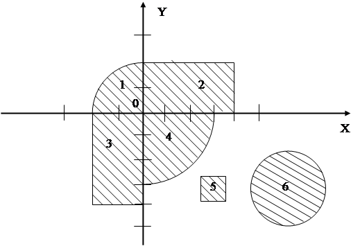 2. Прямоугольник, ограниченный осями OX, OY и прямыми x=4, y=2. 3. Прямоугольник, ограниченный осями OX, ОУ и прямыми x=-2, y=-4. 4. Внутренняя часть сектора, ограниченного положительной частью оси OX, отрицательной OY и окружностью с центром в начале координат и радиусом, равным 3. 5. Внутренняя часть квадрата, ограниченного прямыми линиями x=2, x=3, y=-3, y=-4. 6. Область, лежащая внутри окружности с центром x=5, y=-3 и радиусом= 1,5. Программа: Program Prim6; Label N,K,L; Var x,y:real; f:char; BEGIN N: writeln('введите координаты точки'); readln(x); writeln('x=',x); readln(y); writeln('y=',y); if (x<=0) and (y>=0) and (sqr(x)+sqr(y)<=4) {1-я область} or (x>=0) and (x<4) and (y>=0) and (y<=2) {2- я область} or (x<=0) and (x>=-2) and (y<=0) and (y>=-4) {3- я область} or (x>=0) and (y<=0) and (sqr(x)+sqr(y)<=9) {4- я область} or (x>=2) and (x<=3) and (y<=-3) and (y>=-4) {5- я область} or (sqr(x-5)+sqr(y+3)<=2.25) {6- я область} then writeln('точка с координатами х=',x,' y=',y, 'принадлежит области') else writeln('точка с координатами х=',x,' y=',y, 'не принадлежит оласти); L: writeln('будем ли ещё вводить координаты точки?, Y, N'); readln(f); if (f='Y') or (f='y') then goto N else if (f='N') or (f='n') then goto K else writeln('неправильно нажали клавишу, попробуйте ещё раз'); goto L; K: readln; End.