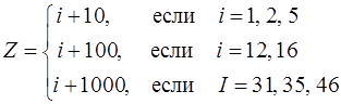 Program Prim7;Var i,z:integer;BEGIN writeln('введите целое i'); readln(i); 1,2,5: writeln('i=',i,' z=',i+10); 12,16: writeln('i=',i,' z=',i+100); 31,35,46: writeln('i=',i,' z=',i+1000); else writeln('неправильно задано i'); end; readln; END. 2. Селектор целого типа – список констант представлен диапазоном. вводится целое i, определить, находится ли оно в диапазоне 1-10 или 11-100, или 101-1000, либо вне этих диапазонов. Program Prim8;Var i:integer;BEGIN writeln('введите целое i'); readln(i); Case i of 1..10: writeln(' число в диапазоне1-10'); 11..100: writeln(' число в диапазоне11-100'); 101..1000: writeln(' число в диапазоне101-1000'); else writeln(' число вне диапазона 1-1000'); end; readln; END. 3. Селектор целого типа, список констант представлены перечнем констант и диапазоном: