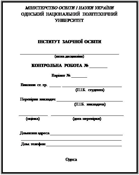 ВИМОГИ ОФОРМЛЕННЯ КОНТРОЛЬНОЇ РОБОТИ Контрольну роботу слід оформити ретельно. За своїм обсягом вона має складати приблизно 12-18 сторінок рукописного тексту. Структура контрольної роботи: 1. Титульний аркуш. 2. Відповіді на теоретичні питання контрольної роботи. 3. Обґрунтовані відповіді на практичні завдання. 4. Список використаної літератури. Робота має бути виконана чітко, розбірливо. Слід залишати поля для зауважень викладача. Робота повинна бути написана українською мовою.