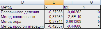 Выводы Если сравнивать сложность алгоритмов рассмотренных выше методов, то все они достаточно просты. Здесь можно выделить метод половинного деления, так как он всегда сходится, если функция непрерывна и имеет корень на рассматриваемом интервале. Это удобно, так как не надо исследовать функцию и выбирать первое приближение для х. Но метод половинного деления требует большего количества итераций, чем другие методы (в данном примере n=10). Время решения уравнений зависит от количества итераций и времени, затрачиваемого на одну итерацию. Время одной итерации зависит от того, сколько раз вычисляется функция и (если это требуется) её производная на одной итерации. Во всех рассмотренных алгоритмах функция на каждой итерации вычисляется один раз. Но в методе касательных (Ньютона) необходимо вычислить ещё и производную функции. Если сравнивать количество итераций, то все зависит от вида функции. В большинстве случаев меньше всего итераций требует метод касательных (в данном примере еще и метод хорд, где n=3). Наименьшая погрешность для рассматриваемого примера в методе половинного деления (-0,00262). Следовательно, приходится выбирать для рассматриваемой функции