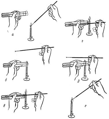 Рис. 7. Посев культуры микроорганизмов в пробирки со средой: а, е – стерилизация петли; б – стерилизация краев пробирки; в, г – взятие и посев материала; д – закрытие пробирок пробками