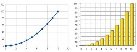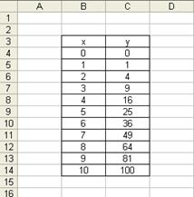 2. На базе построенной таблицы, с помощью мастера диаграмм создайте график функции - Выберите тип диаграммы – Диаграмма XY со значениями, соединёнными сглаживающими линиями (шаг 1 мастера) - В качестве диапазона укажите всю таблицу значений (шаг 2 мастера). - Создайте горизонтальные линии сетки (шаг 4 мастера). - Отключите легенду на диаграмме. - Вставьте диаграмму на текущую страницу (шаг 4). 3. Измените цвет фона диаграммы. Для этого вызовите контекстное меню «области диаграммы» и зайдите в пункт Формат области присвоения. Выберите белый цвет в палитре. 4. Создайте новую диаграмму (Вставка Диаграмма). - Выберите тип диаграммы – Гистограмма, укажите её свойство – трёхмерный вид. (шаг 1 мастера). - Выберите всю таблицу с данными для построения диаграммы. Укажите свойства: Первая строка как подпись, первый столбец как подпись. (шаг 2 мастера). - Отключите легенду на диаграмме (шаг 4 мастера). - Вставьте диаграмму на текущую страницу (шаг 4). - Измените цвет столбцов данных. Для этого вызовите контекстное меню любого столбца диаграммы, выберите пункт «Формат рядов данных» и в палитре выберите жёлтый цвет.