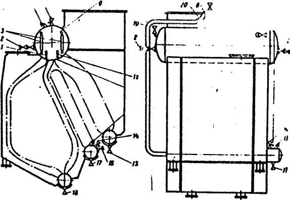 устанавливаются непосредственно на котле; их называют разобщительными. Ниже приводится перечень основной арматуры и контрольно-измерительных приборов, на рис.8 указаны места их примерного расположения на котле. Главный стопорный клапан 13 предназначен для сообщения котла с главным паропроводом. Клапан устанавливают на коллекторе пароперегревателя. Стопорный клапан 6 насыщенного пара служит для сообщения котла с паропроводом насыщенного пара, от которого работают отдельные теплообменные аппараты, механизмы, устройства бытового назначения. Клапан устанавливают на пароводяном барабане котла. Предохранительные клапаны предназначены для обеспечения безопасной работыкотла. Они автоматически сбрасывают избыток пара в случае увеличения его давления в пароводяном барабане выше рабочего. Главный предохранительный клапан установлен на пароводяном барабане котла, предохранительный клапан 14 установлен на коллекторе пароперегревателя. Питательные клапаны 2 служат для подачи питательной воды в котел. По требованию Регистра СССР котел должен иметь не менее двух независимых питательных систем, а значит, и клапанов. Питательная вода представляет собой дистиллированную воду, получаемую в испарительных установках из забортной воды, и содержащую минимальное количество солей. Клапан верхней продувки 23 предназначен для удаления с зеркала испарения плавающих примесей. Он устанавливается на пароводяном барабане. Клапаны нижней продувки 15 и 18 служат для удаления осевшего шлама. Их ставят на водяных барабанах котла. Также клапаны продувания служат для снижения концентрации солей в питательной воде котла. Воздушные клапаны 21 выпускают воздух из пароводяного барабана при заполнении котла водой перед его подготовкой к действию. Клапаны 20 служат для подачи пара к манометрам. По требованию Регистра СССР котел должен иметь не менее двух манометров. Клапан для отбора проб 11 предназначен для отбора проб воды из котла для проведения химических анализов. Водоуказательные колонки 3 служат для контроля уровня воды в пароводяном барабане. Клапан 19 - для подачи пара на свисток или паровой тифон. Клапан I - для ввода присадок в питательную воду. Присадки препятствуютотложению вносимых вместе с питательной водой солей в