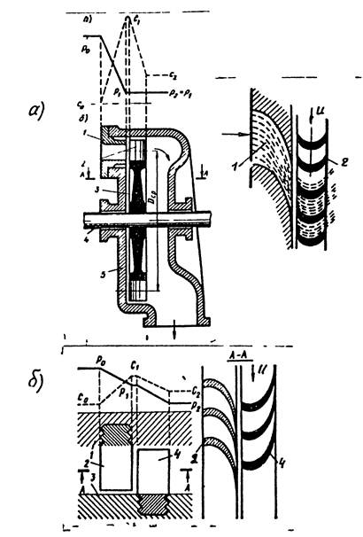 Рис.2 Принцип действия активной (а) и реактивной (б) турбин.