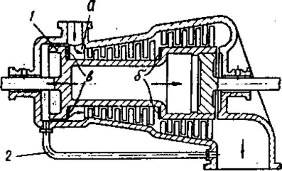рабочие лопатки и Р2у выхода с них вызываем появление дополнительной осевой силы Ра, действующей на лопатку вдоль оси ротора. Силы Рв обоих случаях дают результирующую силу Ррез. Силы Р в обоих случаях направлены в сторону выпуклости рабочей лопатки и вращают ротор всегда в одну и ту же сторону. Отсюда можно сделать важный вывод: турбина - двигатель нереверсивный. В настоящее время одноступенчатые турбины применяются редко. В целях снижения окружной скорости и, и частоты вращения ротора турбины делают многоступенчатыми. Они делятся на турбины со ступенями скорости (только активные) и со ступенями давления (активные и реактивные). Многоступенчатая турбина представляет собой комплекс отдельных ступеней, расположенных последовательно одна за другой, рабочие лопатки которых связаны с одним роторам. Ввиду того, что удельный объем пара по мере его расширения в ступенях турбины возрастает, то площадь проходного сечения в каналах сопел и рабочих лопаток должна увеличиваться, что практически связано с возрастанием высоты сопел и рабочих лопаток турбины по ходу пара от ступени к ступени. На рабочих лопатках любой турбины изменяется (из-за поворота) направление движения пара. Поэтому перед каждым новым рядом рабочих лопаток в многоступенчатой турбине требуется развернуть струю пара к первоначальному направлению. Эту функцию выполняют неподвижные направляющие лопатки, находящиеся между рабочими. Они крепятся либо в корпусе и крышке турбины в статоре - реактивные турбины, либо в специальных неподвижных перегородках, называемых диафрагмами - активные турбины. В ступенях реактивных турбин вследствие расширения пара и на рабочих лопатках получается разность давлений по обе стороны лопаток, создающая осевое усилие. Для его уменьшения применяют общий барабан вместо отдельных дисков для каждого ряда рабочих лопаток, как в активных турбинах (рис. 4), Оставшееся осевое усилие увеличивается от давления пара на кольцевую торцевую поверхность "б" уступа ступенчатого барабана. Для уравновешивания осевого давления в реактивных турбинах со стороны впуска пара устанавливают разгрузочный поршень (думмис) I, диаметром большим диаметра барабана. Со стороны паровпускного канала "а" на кольцевую часть "в" - поршня I действует пар высокого давления. Пространство с другой стороны