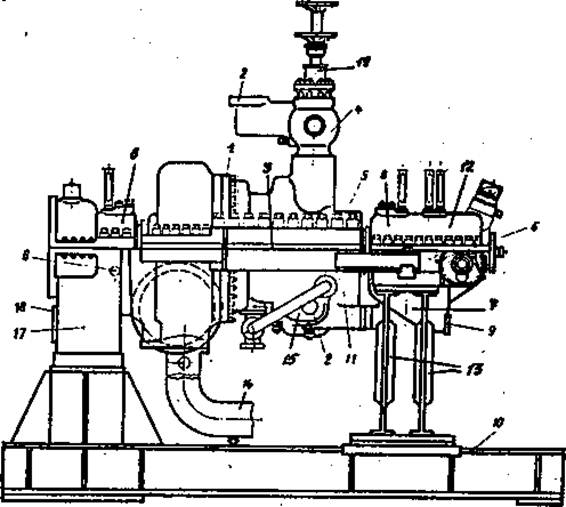 Рис. 4 Многоступенчатая реактивная турбина поршня соединено трубой 2 с выпускным патрубком. Вследствие разности давлений с обеих сторон поршня I создается осевое давление, направленное в сторону, противоположную осевому давлению на рабочих лопатках. Остающаяся неуравновешенной часть осевого давления воспринимается упорным подшипником, нагрузка на который при отсутствии думмиса была бы очень велика. Таким образом, для активной турбины с точки зрения конструкции характерны дисковые роторы и наличие диафрагм, в которые вмонтированы сопла, для реактивной турбины характерны барабанные роторы, в пазах которых закреплены рабочие лопатки, а направляющие лопатки вмонтированы в корпус. КОНСТРУКЦИИ ПАРОВЫХ ТУРБИН Корпус турбины. Основными узлами каждой турбины являются ротор и статор. Статор представляет собой всю неподвижную часть турбины, т.е. корпус и находящиеся в нем сопловые коробки, диафрагмы, лабиринтовые