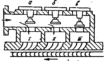 другом болтами. Горизонтальные фланцы корпуса и крышки обрабатывают фрезеровкой и между ними прокладки не ставят, чтобы не менять радиальные зазоры в турбине. На нижней половине корпуса имеются по концам стулья (носовой 7 и кормовой 17), где расположены опорные 8 и упорные 12 подшипники. Корпус опорными стульями расположен на раме 10. Чтобы дать возможность корпусу расширяться в процессе прогрева турбины, стул 7- носового подшипника имеет гибкую опору 13. Кормовой стул 17 приварен к нижней половине корпуса и жестко закреплен на продольной раме 10. В верхнюю и нижнюю половины корпуса имеются патрубки: 2 - подвод пара к турбине; 14 - отвод пара в конденсатор; 6- подвод масла к опорным и упорному подшипникам; 9- слив масла из носового стула; 18 - слив масла из кормового стула. СОПЛА И РЕГУЛИРОВАНИЕ МОЩНОСТИ ТУРБИНЫ Сопла первых ступеней объединяется в так называемые сопловые сегменты, которые обычно устанавливаются и закрепляются во вставных сопловых коробках чаще с помощью болтов, а сами коробки крепятся в корпусе турбины 2. На рис. 6, а сопловая коробка I имеет три группы сопел I, П, Ш, образованных сопловыми сегментами, со своими сопловыми каналами а, б, в. По конструкции сопловые сегменты подразделяются на литые, сборные, наборные из фрезерованных сопел и сварные. На рис. 6, б (вид А) представлен разрез соплового сегмента. Индивидуальные фрезерованные сопла 4 привариваются к кольцевой обойме 3, образуя сегмент, а обойма закрепляется в сопловой коробке I. Мощность турбины зависит от двух параметров: расхода пара через турбину и располагаемого теплоперепада пара перед турбиной. Согласно этому, известны два способа регулирования мощности турбины: сопловое (количественное) и дроссельное (качественное). При дроссельном регулировании, изменяя проходное сечение для пара за счет закрытия маневрового клапана 19 (см. рис. 5), изменяются параметры пара перед турбиной, т.е. располагаемый теплоперепад, что приводит к уменьшению мощности турбины. При сопловом регулировании (см. рис. 6) пар к группам сопел I, П, Ш, поступает через клапаны а, б, в, каждый из которых открывает доступ пара к своей группе сопел. Для уменьшения расхода пара (а значит мощности турбины) некоторые клапаны закрывают, выключая, таким образом, часть сопел.