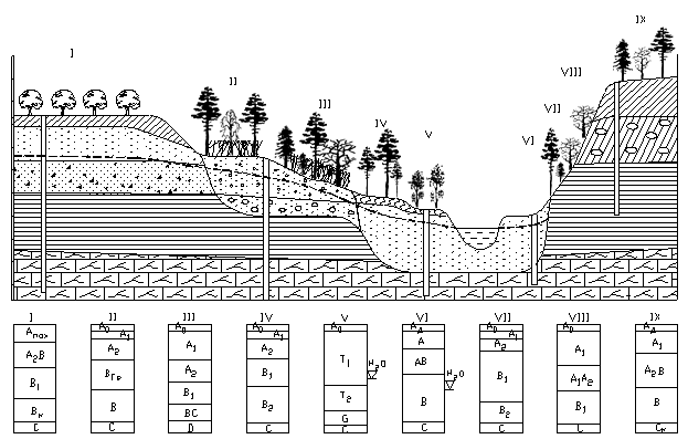 Рис.2 Почвенно-геоморфологический профиль с приуроченными типами насаждений и подземными водами.