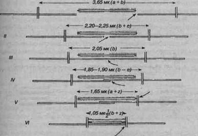 Рис. 14.5. Схема, показывающая степень перекрывания нитей миозина и актина в поперечнополосатом мышечном волокне при различных расстояниях между соседними пластинками Z (А.М. Gordon et al., 1966) На рис. 14.5, показано, как изменяются пространственные отношения нитей при различных расстояниях между соседними пластинками Z (т. е. при различной плотности расположения поперечных полос). Эти расстояния для представленных здесь случаев I—VI указаны также стрелками с соответствующими цифрами на рис. 14.3. При расстоянии 3,65 мк (положение I) нити актина и миозина уже не накладываются друг на друга и можно ожидать, что волокно не будет способно развивать силу; и действительно, примерно при таком растяжении сила сокращения падает до нуля. По мере сближения пластинок Z нити актина все глубже проникают в промежутки между нитями миозина, и, наконец, при расстоянии 2,2 мк (положение П) все боковые выступы на миозиновой нити приходят в контакт с нитью актина, образуя поперечные мостики. Если именно эти мостики ответственны за возникновение силы, то следует ожидать, что в диапазоне от положения I до положения II сила будет пропорциональная степени перекрывания нитей, и это подтверждается в исследованиях. При дальнейшем укорочении волокна число мостиков, которые могут образоваться, не изменяется, и сила остается постоянной, пока расстояние между пластинками 7 не уменьшится до 2,05 мк (положение III). В этот момент нити актина сходятся своими концами и сила начинает убывать. Она продолжает медленно убывать, пока расстояние не достигает 1,65 мк (положение V), когда концы миозиновых нитей приходят в соприкосновение с пластинками Z. При дальнейшем сокращении нити миозина должны сминаться; сила начинает убывать быстрее и, наконец, совсем исчезает.
