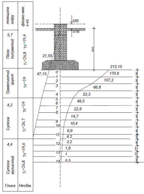 Виконаємо необхідні обчислення і запишемо їх у таблицю 13: h=0.4×b=0.4×1.4=560 мм z – глибина розміщення точки, яка розглядається від підошви фундаменту. Для прямокутних фундаментів: