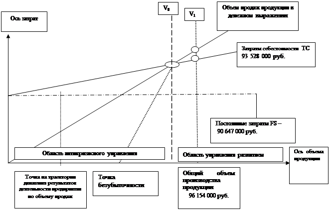 По оси затрат отложим условно постоянные и переменные затраты по молочным и кисломолочным продуктам, исходя из данных таблицы в финансовом плане производства ОАО «Венгеровский молочный завод» Затраты = Общий объем продаж в денежном выражении – Общая суммарная прибыль. Затраты = 96 154 000 руб. — 2 000 руб. = 96 152 000 руб. Общий объем производства продукции на 2004 год составил в денежном выражении 89 852 000 руб. Если же рассмотреть 2005 год ситуация практически не изменилась, хотя будет виден небольшой рост объемов производства. Расчеты говорят о стабильно низком уровне рентабельности. Прибыль составила 2 000 руб., выручка 96 154 000 руб., а себестоимость 93 528 000 руб. Отложим точку по оси объема продукции. Точка пересечения прямой условно постоянных и переменных расходов с прямой объема продукции в денежном выражении проведенной из нулевой отметки является точкой безубыточности. Перпендикуляр, восстановленный к объему производства, даст зону безубыточности производства. Рентабельность можно подсчитать, если найти отношение прибыли к издержкам. Рентабельность в 2004 году находилась на уровне 0,002 %, и в 2005 году рентабельность тоже не изменилась, хотя для данной отрасли она должна быть на уровне не ниже 15%. Что говорит о критическом положении ОАО «Венгеровский молочный завод» и о фактическом кризисе на данном предприятии. Но по прогнозу на 2010 год ситуация изменится и рентабельность предприятия уже составит около 15%. Этого можно добиться путем изменения старой структуры управления на маркетинговую структуру по географическим регионам. Это расширит рынок сбыта, увеличит спрос, а, как известно, спрос рождает предложения – это один из основных законов рынка. Необходимо также снизить издержки до минимума, что позволит уменьшить и без того огромную себестоимость. Для оценки состояния социально-экономического объекта и его местоположения построим график безубыточности по прогнозным данным на 2010 год (Приложение №5). Соответственно ОАО «Венгеровский молочный завод» будет приносить в бюджеты различных уровней достаточно значительные суммы в виде различных налогов (Приложение №6).