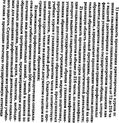 нальной сферы может осуществляться как по определенным специальностям, так и по соответствующим направлениям, которые закреплены Классификатором направлений и специальностей. Согласно этому документу специальности «социальная педагогика» присвоен номер 031300, а направлению «Педагогика», в которое социальная педагогика входит наряду с такими профилями подготовки, как дошкольное образование, начальное образование, коррекционная педагогика и специальная психология, физическая культура, — номер 540500. Наибольшее распространение в вузах страны на сегодняшний день получила подготовка социальных педагогов по специальности «социальная педагогика» согласно Государственного образовательного стандарта специалиста, который включает характеристику сферы и объектов профессиональной деятельности специалиста; его основную квалификацию, под которой понимается уровень обученности, подготовленности выпускника к выполнению определенного вида профессиональной деятельности в соответствии с полученной специальностью; требования к уровню подготовки лиц, завершивших обучение по основной образовательной программе специальности; обязательный минимум содержания профессиональной образовательной программы по специальности, а также нормативные характеристики обучения. Требования к уровню подготовки лиц, завершивших обучение по программе специальности «социальная педагогика», включают пять частей: 1) общие требования к образованности специалиста, нацеленные на сформированность мировоззренческих установок человека, стиля его профессиональной и исследовательской деятельности, его культуры; 2) требования к знаниям и умениям по дисциплинам общекультурологической подготовки, обеспечивающей основы знаний философии, социологии, культурологии, права, религии и т. д.; 3) требования к знаниям и умениям по дисциплинам медико-биологической подготовки, выявляющие знания выпускника по таким разделам, как медицина, валеология, безопасность жизнед еяте л ьноти; 4) требования к знаниям и умениям по дисциплинам психолого-педагогической подготовки, вооружающим выпускника зна^ ниями в области таких наук, как общая педагогика, социальная педагогика, коррекционная педагогика, возрастная психология, социальная психология, педагогическая психология и др.; 5) требования к знаниям и умениям по дисциплинам предметной подготовки, которая обеспечивает выпускника профессиональными знаниями и умениями в области истории и теории социальной педагогики, методик и технологий социально-педагогической деятельности, управления социально-педагогическими системами и др. В соответствии с этими требованиями обязательный минимум содержания профессиональной образовательной программы по специальности «социальная педагогика» обеспечивается пятью блоками дисциплин: общекультурным, медико-биологическим, психолого-педагогическим, предметным и блоком дисциплин специализации, которые предполагают углубленную подготовку по конкретному виду профессиональной деятельности будущего специалиста. Нормативная длительность обучения по специальности — 5 лет. Завершается программа итоговой аттестацией, включающей защиту выпускной работы. По окончании обучения выпускнику присваивается основная квалификация «социальный педагог». Если вуз реализует мног