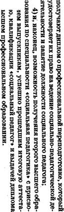 СПО НПО Общеобразовательное учреждение где НПО — начальное профессиональное образование; СПО — среднее профессиональное образование; ВПО — высшее профессиональное образование. В непрерывной системе подготовки социально-педагогических кадров уровень начального профессионального образования на сегодняшний день, к сожалению, отсутствует. Но несомненно такой вид образования может и должен существовать, во всяком случае, такая подготовка специалистов достаточно широко практикуется в некоторых странах. Подготовка социальных педагогов в средних профессиональных учебных заведениях Одним из типов учебных заведений, в которые могут поступить выпускники, окончившие полную среднюю школу, являются средние профессиональные учебные заведения, успешно функционирующие в России. Подготовка социальных педагогов данного профессионального уровня в настоящее время, в основном, начала осуществляться в педагогических училищах и колледжах. Эти учебные заведения традиционно готовили специалистов для работы с детьми дошкольного и младшего школьного возраста. Поэтому такие учебные дисциплины, как педагогика, психология, медицина и другие, сравнительно легко могут быть адаптированы для подготовки социальных педа- гогов, а это значит, что требуются небольшие материальные затраты для подготовки новых специалистов и переподготовки работающих преподавателей. Материально-техническая база педучилищ также обеспечивает подготовку новых кадров при сравнительно небольших финансовых затратах (пополнение библиотечного фонда специальной литературой, переоборудование ряда кабинетов и др.) В настоящее время принят государственный образовательный стандарт среднего профессионального образования, разработаны учебные планы, учебные программы отдельных курсов. Особенностью подготовки таких специалистов является их практико-ориентированная направленность. Профессиональная деятельность специалиста этого уровня направлена на социализацию детей дошкольного и младшего школьного возрастав различных типах образовательных учреждений: дошкольных учреждениях, начальных классах общеобразовательных учреждений, учреждениях дополнительного образования, центрах досуга и творчества детей, учреждениях детского отдыха детей, детскиПР домах, школах-интернатах для детей с проблемами. При подготовке специалистов учитывается конкретный вид деятельности, которым будет заниматься социальный педагог, а также конкретные учреждения, в которых он будет работать. Основными видами деятельности социального педагога, имеющего среднее профессиональное образование, являются: — оказание помощи детям в преодолении проблемных ситуаций при реализации соответствующей образовательной программы; — организация деятельности детей, обеспечивающей их развитие в соответствии с индивидуальными и возрастными особенностями; — создание благоприятных педагогических условий для развития, воспитания и образования детей; — осуществление сотрудничества с родителями по вопросам воспитания детей; — организация культурно-просветительской работы в микросоциуме с целью совершенствования социально-педагогической деятельности специалиста; — самообразование с целью повышения уровня квалификации и совершенствования педагогического мастерства. По окончании