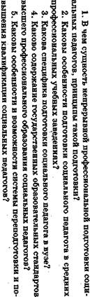 Принятие Правительством Российской Федерации закона «Об образовании» (1992) и закона «О высшем и послевузовском профессиональном образовании» (1996) закрепило политику государства в сфере образования, основанную на принципах гуманизации, фундаментализма, универсальности и альтернативности, преемственности и прогностичности. Принцип гуманизации реализуется через целенаправленную ориентацию образования на личность обучаемого, выявление, и развитие всех сущностных сил человека, приоритетное внимание к гуманистическим традициям, общечеловеческим ценностям. Принцип фундаментализма обеспечивает целостность, глубину и взаимопроникновение социально-философских, общепрофессиональных и специальных знаний при подготовке специалиста. Фундаментализм обеспечивает высокий общекультурологический уровень образования, органическое сочетание теоретической и практической подготовки кадров, позволяет преодолеть ее узкую профессиональную направленность. Принцип универсальности и альтернативности реализуется через удовлетворение запросов общества в определенных специалистах и обеспечивает полный набор специальностей, востребуемых на рынке труда. Принцип преемственности реализуется через образовательные программы различных ступеней и видов образования, через различные типы образовательных учреждений. Прогностический принцип обеспечивает полифункциональную, всестороннюю подготовку специалистов на перспективу в рамках проведенного прогноза востребуемости специалистов для конкретного региона и для решения конкретных проблем. Система образования, построенная на перечисленных выше принципах, помогает человеку сориентироваться в спектре разнообразных специальностей, получить то образование, которое в данный период времени доступно и соответствует его реальным возможностям, изменить профиль образования, если первоначальный выбор оказался не очень успешным, и получить такое количество государственных сертификатов и дипломов, которые обеспечат конкурентоспособность специалиста на рынке труда и построение его профессиональной карьеры. Система подготовки социально-педагогических кадров, которая в настоящее время еще только начинает формироваться, также развивается в соответствии с концепцией непрерывного образования. Первой ступенью в этой системе является допрофессиональ- ная подготовка социальных педагогов, которая на сегодняшний день пока не получила широкого распространения и признания. Тем не менее в общеобразовательной школе обязательно должна проводиться ориентация на социальную педагогику как на новую и перспективную профессию. Создание системы такой допрофессиональной подготовки требует решения многих организационных и научно-методических проблем, однако она создается не совсем на пустом месте и должна вобрать в себя положительный опыт системы профориентации школьников, которая и содержательно, и организационно достаточно эффективно функционировала в нашей стране в 70-80-е годы, и которая сегодня, в связи с изменившимися условиями, сама требует новых серьезных, концептуальных (методологических, теоретических и методических) разработок. Допрофессиональная подготовка может осуществляться при участии заинтересованного профессионального руководителя в старших классах школы, где с 
