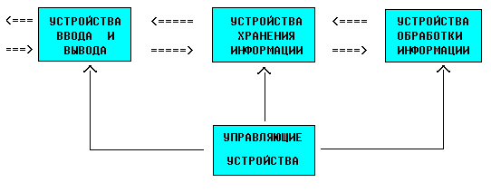 Рис. 1. Общая структура компьютера Запоминающее устройство - это блок ЭВМ, предназначенный для временного (оперативная память) и продолжительного (постоянная память) хранения программ, входных и результирующих данных, а также промежуточных результатов. Информация в оперативной памяти сохраняется временно лишь при включенном питании, но оперативная память имеет большее быстродействие. В постоянной памяти данные могут сохраняться даже при отключенном компьютере, но скорость обмена данными между постоянной памятью и центральным процессором, в подавляющем большинстве случаев, значительно меньше. Арифметико-логическое устройство - это блок ЭВМ, в котором происходит преобразование данных по командам программы: арифметические действия над числами, преобразование кодов и др. Управляющее устройство координирует работу всех блоков компьютера. В определенной последовательности он выбирает из оперативной памяти команду за командой. Каждая команда декодируется, по потребности элементы данных из указанных в команде ячеек оперативной памяти передаются в АЛУ; АЛУ настраивается на выполнение действия, указанной текущей командой (в этом действии могут принимать участие также устройства ввода-вывода); дается команда на выполнение этого действия. Этот процесс будет продолжаться до тех пор, пока не возникнет одна из следующих ситуаций: исчерпаны входные данные, от одного из устройств поступила команда на прекращение работы, выключено питание компьютера. Описанный принцип построения ЭВМ носит название архитектуры фон Неймана - американского ученого венгерского происхождения Джона фон Неймана, который ее предложил.