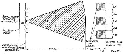 Рис. 22. Схема комбинированных испытаний (ходовых). На расстоянии 6 м (по горизонтали) от вершины душ сектора и симметрично биссектрисе центрального угла сектора расположены три участка размером 4 X 4 м, политые бензином и разделенные 3-метровым интервалом. Эти участки защищены со стороны основного сектора экранами, чтобы помешать действию лафетных стволов (мониторов).