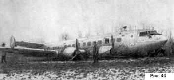Рис. 44. К. счастью, не все самолеты и не всегда загораются при вынужденной посадке. Доказательством может служить этот самолет, приземлившийся "на живот" поблизости от аэродрома Бурже без особого ущерба для себя. ров и атаковали огонь на правом моторе, чтобы облегчить выход пассажиров из самолета. В 14 час. 42 мин. все пассажиры были выведены из самолета и сам самолет был вне опасности. Прибыв на пожар, машины станции приступили к атаке огня также и па левом моторе. Следует отметить, что в мо мент прибытия помощи оба мотора вращались на полных оборотах так как экипаж не мог их остановить. Они были остановлены лишь благодаря подаче пены в обтекатель воздухозаборника, причем струя пенных стволов была направлена "через винты".