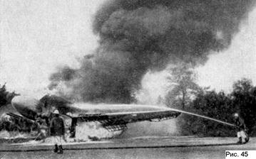 Рис. 45. Пример неправильных действий. Это бывает тогда, когда пожарные не подготовлены для борьбы с огнем на самолетах. Если самолет горит в луже бензина на земле, следует прежде всего атаковать эту лужу и потушить ее, прежде чем переходить к тушению самого объекта.