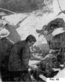 Рис. 47. Еще один пример неправильных действий. Здесь также действует персонал, не обученный для борьбы с огнем на самолетах. Этот пример доказывает, что длительная работа лафетными стволами может привести к ошибкам. За исключением редких частных случаев, применение этих стволов оправдывается лишь при атаке больших луж бензина, горящего на земле не более чем в течение 1 мин. Как можно быстрее надо переходить на работу ручными стволами.