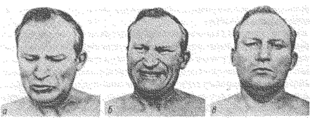 Рис 8. Больной лицевым параспазмом. а — двусторонняя симметричная тоническая судорога лицевых мышц. Интенсивное судорожное сокращение круговых мышц глаз лишает больного возможности что-либо видеть, спазм мышц рта затрудняет речь и еду; б — во время очень коротких (несколько секунд) промежутков между приступами спазма еще сохраняется тоническое напряжение мышц, которое произвольно, за счет сокращения антагонистов, преодолевается с большим усилием и быстро утомляет больного; в — после курса лечения аутогенной тренировкой остается лишь некоторое напряжение круговых мышц глаз, не нарушающее зрения. (По Лобзину). Накапливается опыт проведения групповой психотерапии при различных заболеваниях нервной системы, в частности лиц, страдающих сосудистыми заболеваниями. На первых занятиях рассматриваются особенности заболевания (течение, прогноз); в дальнейшем обсуждаются проблемы, волнующие обычно таких пациентов, — необходимость и пути повышения их эмоционально-волевой и социальной активности, коррекция установок и отношений к различным социально-бытовым условиям, адекватное отношение к симптомам заболевания, противодействие их возникновению. Обсуждаются проблемы, связанные с возвращением больных в семью (здесь важна и семейная психотерапия), подготовкой к выходу на пенсию и, в связи с этим, к новому укладу жизни. При соответствующих показаниях групповую психотерапию можно сочетать с гипнотерапией и другими видами психотерапии в той же группе. При проведении психотерапии у больных с сосудистыми заболеваниями нервной системы необходимо учитывать их повышенную ранимость и лабильность психики; неосторожное поведение психотерапевта может привести к ятрогениям и дидактогениям. Демиденко, Балунов применили методы психотерапии в системе комплексной восстановительной терапии постинсультных больных. Объектом лечебного воздействия являлись реактивно-личностные наслоения (снижение самооценки, потеря веры в выздоровление), особенно выраженные у больных с тяжелыми дефектами двигательных, сенсорных и других функций. Лечение осуществлялось в малых группах и включало различные формы рациональной психотерапии — групповые занятия с использованием приемов «психотерапевтического зеркала», «коррекции масштаба переживания», «лечебной перспективы», музыкотерапии, способствующих выработке адаптивных установок и мобилизации собственной активности больных. Существенное место отводилось элементам психогимнастики, двигательной терапии, наиболее адекватным для решения задач эмоциональной и моторной активации больных. С целью опосредованного воздействия на локальный дефект использовались различные игровые методики и специальные приемы идеомоторной тренировки. Большое значение приобретала семейная психотерапия — разъяснительная работа с родственниками больного с целью их ориентации на адекватное отношение к пациенту и его заболеванию, а также обучение навыкам ухода за больными. Особенностью занятий по групповой психотерапии с больными, перенесшими инсульт, является участие в них (помимо психотерапевтов) медицинских сестер. В групповых дискуссиях (30-минутные занятия 5 раз в неделю) коррекции подвергаются неверные представления пациентов о параличе, проблемы выздоровления и предупреждения повторных инсультов. 