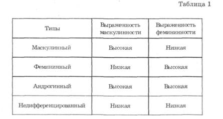 женщины исполняли совершенно различные роли, иногда прямо противоположные общепринятым стереотипам, считающимся «естественными» для каждого пола. Одна из идей, декларируемых движением феминизма начала 70-х годов, состояла в том, что традиционные гендерные роли сдерживают личностное развитие и реализацию имеющегося потенциала. Эта либеральная гуманистическая философия послужила толчком для разработки концепции Сандры Бем,33 в основе которой лежит понятие андрогинии, согласно которому любой человек, независимо от биологического пола, может обладать как чертами маскулинности, так и фемининности, соединять в себе как традиционно мужские, так и традиционно женские качества. Это позволяет людям менее жестко придерживаться полоролевых норм и свободно переходить от традиционно женских занятий к традиционно мужским. С. Бем был специально разработан опросник для определения уровня маскулинности и фемининности, понимаемых как независимые измерения личности. Согласно ее тесту, по этим параметрам мужчин и женщин можно разделить на четыре группы, приведенные в таблице.34