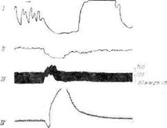 Фиг. 2, Нервные и гуморальные симпатич?ские влияния при раздражении заднего отдела гипоталамуса [316]. Опыты па кошке под пентоталовым наркозом н флакееднлом. Характеристика раздражений: А. 1,5 в, 71 имп/сек. продолжительность импульса 1,6 мсек, длительность раздражения 7 сек. 15. Те же условий, но продолжительность импульса 0,8 мсек. Видно, что более длительные импульсы вызывают секреторную активность мозгового вещества надпочечников, что ведет к сокращению денервированного третьего века. / — нормальное третье веко; // — де-исринрованнос третье веко; /// -— кровяное давление. Генерализованный характер реакции, вызываемой раздражением гипоталамуса, иллюстрирует фиг. 3, на которой приведена запись активности мочевого пузыря, кишечника, денервированного третьего века и кровяного давления. Раздражение заднего гипоталамуса вызывает ослабление перистальтики кишечника и сокращение мочевого пузыря, повышение кровяного давления и секреторную активность мозгового вещества надпочечников (о чем свидетельствует сокращение денервированного третьего века). Все эти реакции совпадают с результатами раздражения эфферентных симпатических нервов, идущих к соответствующим органам. Следует отметить, что на кишечник и мочевой пузырь симпатическая η ГЛАВА li система оказывает тормозящее' влияние, а на гладкие мышцы кровеносных сосудов и миокард (не регистрировалось) — возбуждающее. Данный эксперимент показывает, что гипоталамус может быть источником генерализованного симпатического разряда, подавляющего одни вегетативные эффекторы и возбуждающего другие [318].