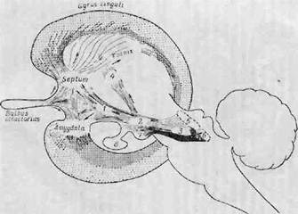 Фиг. 6. Основные отделы коры головного мозга человека на разрезе [5S3]. А. У эмбриона 15 мм. Б. У эмбриона 50 мм. В. У взрослого (основная массч гнпнокампа у взрослого сдвинута назал.. в плоскость разреза но попала). ГЛАВА III в основном в связи со слуховыми и зрительными дистантными рецепторами, особенно в связи с органом зрения и возникновением исполнительных механизмов, посредством которых можно влиять на зрительную информацию. Однако первичная кора (с ее подкорковыми придатками) не исчезает и не утрачивает своих функций. Следует признать, что ее функции не вполне ясны и в какой-то части гипотетичны, но несомненно одно, что эта кора играет важную роль в регуляции висцеральных функций и эмоциональных процессов, связанных с внутренними состояниями. Мак-Лин [600] назвал эту кору «висцеральным мозгом», а последние исследования пролили свет на ее роль в организации эмоций и мотивации поведения. После описания основных анатомических связей мы рассмотрим экспериментальные данные, которые подтверждают важную роль лимбических и гипоталами-ческих структур в эмоциональных процессах. Афферентный обонятельный путь начинается биполярными нейронами в обонятельном эпителии. Дисталь-ные концы этих нейронов прободают кутикулу эпителия и служат обонятельными рецепторами. Тела нейронов лежат среди опорных клеток обонятельного эпителия, а их короткие аксоны идут в составе обонятельного нерва через горизонтальную пластинку решетчатой кости, оканчиваясь в обонятельной луковице. Последняя.представляет собой первичный обонятельный центр [605]. У низших млекопитающих и у эмбрионов высших млекопитающих на ранних стадиях развития обонятельная луковица — это не что иное, как наиболее ростральная часть первой, или обонятельной, доли полушарий. В мозге человека она представляет собой относительно небольшое образование, лежащее на основании мозга; от этого образования берет начало обонятельный тракт, который в каудальном направлении делится на латеральную, медиальную и промежуточную полоски. Промежуточная полоска сразу же погружается в переднее продырявленное вещество (или у некоторых видов — в обонятельные бугорки). У человека она мала, непостоянна и, вероятно, не имеет большого функционального значения. Чтобы понять анатомические связи обонятельных структур ствола мозга и новой коры, необходимо знать НЕРВНЫЙ СУБСТРАТ ЭМОЦИИ их эволюцию. На фиг. 7 схематически показано развитие медиальной обонятельной полоски. В мозге амфибии (тритона) обонятельная луковица — это фактически обонятельная доля, наиболее ростральная часть головного мозга. Волокна, идущие от нее каудально, по направлению к медиальным частям переднего мозга (гиппо-