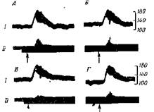 Фиг. 30. Снижение парасимпатической реактивности переднего отдела гипоталамуса после локальной инъекции пентотала [740]. ' — кровяное давление; // — пульс. А и Г. Контрольное введение норадрена-лина (5 мкг) до и через 20 мин после введения пентотала. Б. Введение ио-радреналиня (5 .мкг) после введения пентотала в задний отдел правого гипоталамуса. В. То же после двухстороннего введения пентотала. Перерыв между В и Г —Я) мин. Одностороннее введение пентотала (Б) значительно снижает парасимпатическую реакцию замедления сердечного ритма, а двухстороннее введение {В) полностью снимает эту реакцию. Таким образом, между двумя.отделами гипоталамуса существуют реципрокные отношения, по крайней мере в омысле вегетативных реакций. Когда при поражении заднего гипоталамуса снижается его.реактивность, повышается возбудимость переднего парасимпатического отдела, и наоборот. Эти реципрокные отношения необходимо учитывать при анализе сдвигов равновесия. ГЛАВА V наступающих в вегетативных системах гипоталамуса пол влиянием гипотензивных или гипертензивных веществ. Реактивность одного отдела может изменяться косвенно при изменении реактивности другого отдела [310]. Наконец, следует подчеркнуть, что изменения вегетативных рефлексов, определяющих степень падения кровяного давления при применении веществ группы мехо-лила и замедление сердечного ритма при ©ведении веществ группы нор адреналина, связаны с определенными центрами мозга. Даже обширные разрушения в соседних областях таламуса не сопровождаются характерными изменениями в действии мехолила и иорадреналина. ГЛАВА V' ПРОБЫ С МЕХОЛИЛОМ И НОР АДРЕНАЛИНОМ В НОРМЕ И ПАТОЛОГИИ
