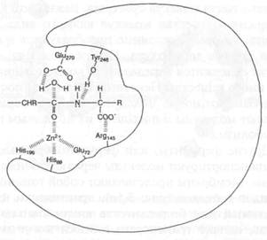Рис. 3.4. Структура фермента карбоксипептидазы. На рисунке показано, как аминокислоты (обозначенные буквенными сокращениями с порядковыми номерами) образуют активный центр именно той формы, которая необходима для проведения определенной химической реакции. Этот пищеварительный фермент расщепляет белковые молекулы пищи. В реакции участвует ион цинка (Zn). Поперечными черточками обозначены взаимодействия атомов и молекул Фермент и субстрат часто сравнивают с замком и ключом, потому что они подходят друг к другу по форме, но не следует забывать и о том, что в ходе процесса их форма меняется. Ферменты — настолько прекрасные катализаторы, что могут ускорять реакции в тысячи раз, и отдельная молекула фермента может за секунду обработать несколько тысяч молекул субстрата. Важно, что клетка содержит множество молекул каждого вида метаболита, которые постоянно преобразуются в молекулы другого метаболита. Поэтому говорят, что в клетке содержится определенная концентрация того или иного вещества. Некоторые ферменты постоянно добавляют новые молекулы, а другие ферменты удаляют молекулы и посылают их по разным путям метаболизма. Другие ферменты, или ферментообразные белки, транспортируют молекулы через клеточные мембраны. Мембраны представляют собой тонкий слой липидов и белков (рис. 3.5а), практически непроницаемый для большинства мелких молекул и ионов, однако транспортные белки могут доставлять молекулы внутрь клетки или выводить их наружу, а также перемещать их между разными отделами клетки. На рис. 3.56 показано, как может действовать один из видов транспортных белков. Белок, расположенный в липидном слое, образует канал. Внутри этого канала имеются участки определенной формы, которые, как и активный центр, могут присоединять к себе молекулы исключительно специфической формы. Когда молекула заходит в канал с одной стороны мембраны и присоединяется к активному участку, белок сокращается и выталкивает молекулу через канал с другой стороны мембраны. Некоторые транспортные белки используют энергию для того, чтобы накапливать одни виды молекул внутри клетки и выводить другие наружу, регулируя таким образом состав внутриклеточной жидкости.