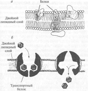 Рис. 3.5: а — клеточная мембрана представляет собой тонкий двойной слой молекул липидов с вкраплениями разного рода белков. Большинство молекул, неспособных растворяться в жире, не может пройти через этот липидный слой; б— через транспортные белки проходит узкий сквозной канал. Отдельные мелкие молекулы, или ионы, с одной стороны мембраны присоединяются к участкам этого канала, после чего белок меняет форму и выпускает эти молекулы с другой стороны мембраны