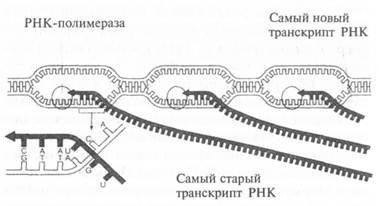 Сейчас доказано, что РНК образуется в результате того же спаривания комплементарных оснований, с помощью которого образуется и двойная спираль ДНК из одинарной цепи (рис. 9.2). Этот процесс называется транскрипцией. Его выполняет особый сложный фермент — РНК-полимераза. Возле каждого гена располагается участок — промотор с последовательностью оснований, к которым присоединяется РНК-полимераза, или, как говорится, которые она распознает.